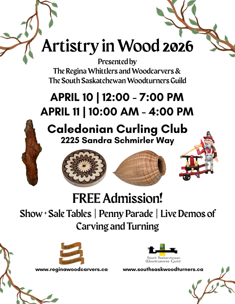 Back for 2026, the Annual Artistry in Wood Show presented by the Regina Whittlers and Woodcarvers and South Saskatchewan Woodturners Guild is coming up on April 11 + 12, 2026. This show brings together carvers, whittlers, turners, woodworkers, and vendors, and enthusiasts of all things woodworking together in Regina! At the show, you’ll find carving and turning demonstrations, dozens of woodworkers sharing their talents and selling their wares, and get the chance to connect with woodworkers and learn from extremely talented artisans!